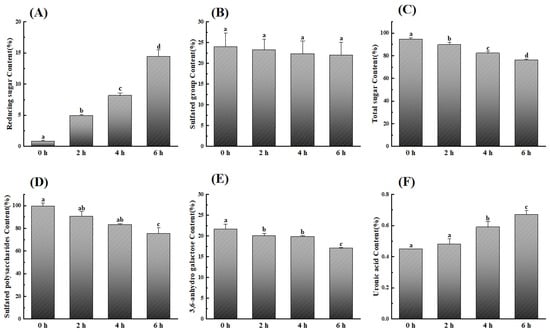 Changes in chemical compositions of κ-carrageenan. (A) Reducing sugar content, (B) sulfated group content, (C) total sugar content, (D) sulfated polysaccharide content, (E) 3,6-anhydro galactose content, and (F) uronic acid content. Data are expressed as the mean ± SD (n = 3). Graph bars marked with different letters on top represent statistically significant results (p < 0.05) based on one-way analysis of variance (ANOVA) with Duncan’s range tests, whereas bars marked with same letter correspond to results that show no statistically significant differences.