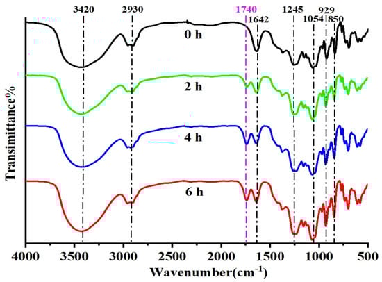 FT−IR spectra of κ-carrageenan after 0 h, 2 h, 4 h, and 6 h photocatalytic reaction.