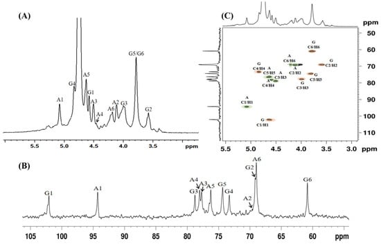 (A) 1H NMR, (B) 13C NMR, and (C) HSQC spectra of DC-6. Correlation peaks are marked on the spectrum: G4S (G)—orange and AnGal (A)—green.