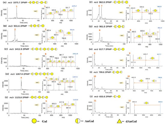As presented in Figure 6C, the pseudo-molecular ion of Peak 3 was at m/z 1411 [M+H]+, which gave product ions at m/z 1267 [M-AnGal+H]+, m/z 1105 [M-AnGal-Gal+H]+, m/z 961 [M-AnGal-Gal-AnGal+H]+, m/z 799 [M-AnGal-Gal-AnGal-Gal+H]+, m/z 655 [M-AnGal-Gal-AnGal-Gal-AnGal+H]+, and m/z 493 [M-AnGal-Gal-AnGal-Gal-AnGal-Gal+H]+ in MS2. Thus, Peak 3 was speculated as a PMP-labeled heptasaccharide, AnGal→Gal→AnGal→Gal→AnGal→Gal→AnGal. Similarly, oligosaccharides from disaccharide to hexasaccharide constructed with the alternate AnGal and Gal residues were found according to Figure 6D–J.