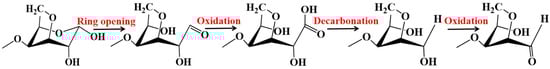 Moreover, the photocatalytic depolymerization rule was proposed in Figure 8 according to the degradation products. The major proportion (57.4%) of the degradation products demonstrated AnGal at their reducing end, and 17.5% was its decarbonylated derivative, dAnGal, at the reducing end. This suggests that AnGal’s glycosidic bond is more ready to be attacked by free radicals. Notably, the rule of photocatalytic depolymerization was different from those of other depolymerization methods. Carrageenase could degrade κ-carrageenan to yield even-numbered oligosaccharides with AnGal at the non-reducing end and Gal at the reducing end [], while acid hydrolysis could produce odd-numbered oligosaccharides with Gal at both the reducing and non-reducing ends []. In the present study, similar amounts of odd and even numbers of κ-carrageenan oligosaccharides were obtained by photocatalytic degradation, and more AnGal or its derivative were observed at the reducing ends. Thus, the degradation result of photocatalytic reaction was different from those of enzymatic degradation and acid hydrolysis.