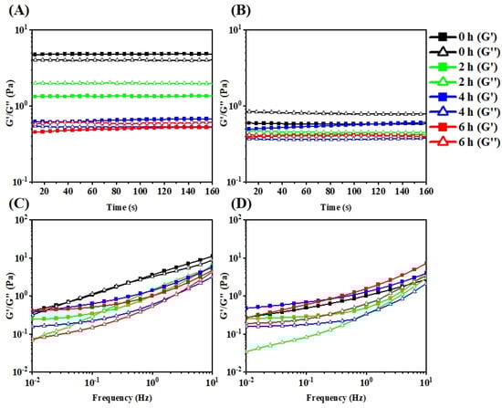 The storage modulus (G′) (solid symbols), loss modulus (G″) (open symbols) of κ-carrageenan, DC-2, DC-4, and DC-6 under the time range of 0–160 s at (A) 4 °C and (B) 25 °C and under the frequency scope of 0.01–10% at (C) 4 °C and (D) 25 °C.