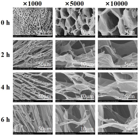 Overall, κ-carrageenan showed a typical gel network structure, which had large pores and thick and homogeneous pore walls. Notably, the pore walls of degradation products became thinner, and imperfectly linked with some filamentous structures. It could be noticed that with the extension of photocatalytic time, the degradation products became irregular and broken. The microstructure features are in line with the result that the degradation products would lose their gel-like behavior with the increase of degradation time.