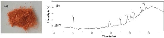 (a) EEJM powder appearance and (b) EEJM fingerprint chromatogram in 280 nm for identification of secondary metabolites.