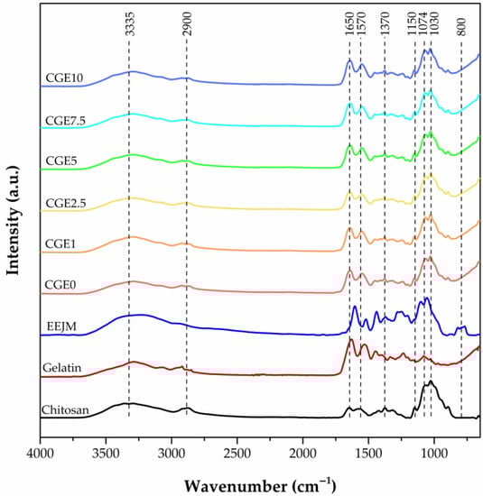 The scaffold spectra show a good mixture of the components in all of the developed compositions as the characteristic bands of chitosan, gelatin and EEJM can be observed. The chitosan/gelatin interaction might be a result of the partial conversion of the electrostatic bonds into chemical by hydrogen bonding, resulting from the interaction of the protonated amine of the chitosan and the carboxyl groups of the gelatin [54].