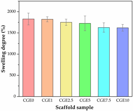 Considerably high SD values were reached (Figure 3), and a profile of a decrease in the property could also be observed with the increase in EEJM content in the scaffold, reaching, for CGE10, an average SD of 1620.89 ± 79.01. However, according to the Tukey’s test, the means of the SD do not differ statistically (p-value = 0.168). Once the samples have been neutralized, the high SD value can be associated with the porous structure and gelatin content due to the hydrophilic character of such biopolymer [71]. The authors of other studies report even higher values than those found here for chitosan/gelatin scaffolds [72]. This suggests that crosslinking with genipin occurred as it induces the formation of more crosslinks in the scaffolds, in turn decreasing the SD [73]. As for the decrease in the property with the increase in the EEJM content, this may be associated with the fact that the solution becomes more concentrated or that the addition of the extract has promoted a slightly less hydrophilic character to the composition.