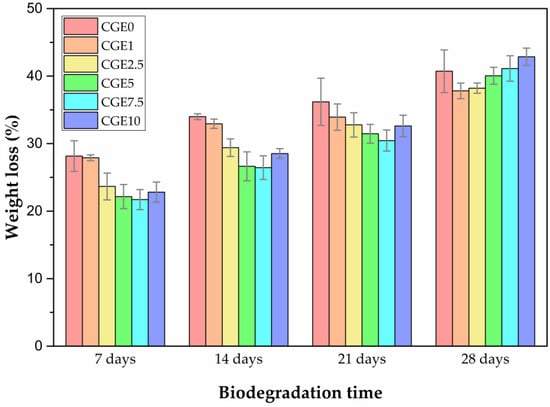 The enzymatic biodegradation of the scaffolds (Figure 4) follows a pattern for the intervals of 7, 14, and 21 days, in which the increase in the extract content promotes a smaller weight loss, with the exception of the CGE10 sample, although this one still reaches lower values in 21 days to those obtained for CGE0 (sample without EEJM), of 32.61 ± 1.60 and 36.19 ± 6.49, respectively. After 28 days, the biodegradation profile is different, which is attributed to an increase in the breakdown of crosslinks, which makes the material (EEJM) more susceptible to degradation due to weight loss. Based on the Tukey’s test, the statistical significance of the addition of EEJM on the weight loss of the samples during the test period was confirmed (p-value = 0.037). It is noteworthy that in the evaluated period (28 days), the scaffolds showed a maximum mass loss of 42.89 ± 1.28% (CGE10), which can be attributed to crosslinking with genipin as the reported values of mass loss in the literature are superior to chitosan/gelatin scaffolds crosslinked with other agents [16,68].