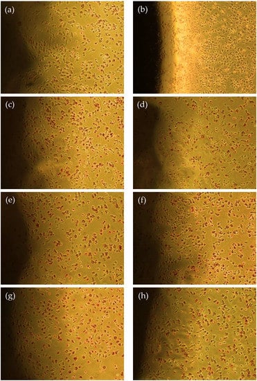 The negative control, HDPE, did not promote cell lysis (Figure 6a), while for the positive control, toxic latex, cell lysis was observed as a discoloration halo was formed (Figure 6b), reaching a cytotoxicity degree of 4 (severely cytotoxic) (Table 4). There is also no formation of discoloration halos for any of the compositions of the tested scaffolds (Figure 6c–h); thus, the samples did not promote cell lysis. The results confirm that chitosan/gelatin scaffolds loaded with EEJM up to 10% (w/w) are non-toxic to L929 cells, emphasizing their potential use as skin tissue engineering materials.