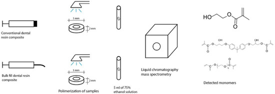The objective of this study was to determine all possible residual monomers from conventional and bulk-fill composites (high and low viscosity) leaching from the materials after different time intervals (24 h, 7 days, and 28 days) using more accurate and sensitive liquid chromatography coupled with triple quadrupole tandem mass spectrometry (LC-MS/MS). For this study, the following two working hypotheses were made: (1) there is no elution of residual monomers after polymerization of conventional and filled resin composites; (2) there is no difference in elution between conventional and filled composites with high and low viscosity; (3) there is no difference in monomer elution measured after 24 h, 7 days and 28 days.