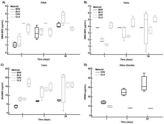 Amounts of leachable compounds detected by LC-MS/MS across different dental materials from the same provider (Filtek Panel (A); Tertic Panels (B,C); Gradia Panel (D)) in ethanol medium incubated at 37 Degrees Celsius for 24 h, 7 days or 28 days. BHV—Bulk high viscosity material, BLV—Bulk low viscosity material, CHV—Conventional high viscosity, CLV—Conventional low viscosity. Each material was sampled in three replicates and each replicate is represented by a mean of three LC-MS/MS measurements. Bis GMA (Bysphenil-glycidyl-methacrylate), DMA BEE (4-dimethylaminobenzoic acid ethyl ester), HEMA (2-Hydroxyethyl methacrylate).