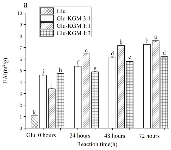 In the process of emulsion formation, EAI shows the adsorption capacity of proteins at the oil-water interface [31]. In Figure 9a, it can be seen that the EAI value of gluten is 1.065 m2/g. After adding KGM, EAI was significantly improved, and it increased with the increase in reaction time. After 72 h of reaction, the EAI value of the Glu-KGM 1:1 conjugate was the highest. During the Maillard reaction, the structure of the protein could swell and become more flexible, which can increase its emulsifying activity. In addition, the average particle size in the Glu-KGM 1:1 conjugate was the smallest, which can form a thicker interfacial layer to improve the stability of steric orientation [32].