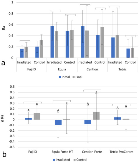 Initial and final values for the roughness parameter Ra (a), and Δ Ra values, calculated as Ra change between initial and final values (b). All data are represented as mean ± 1 SD. The square brackets above the bars indicate statistically similar values. The same uppercase letters denote statistically similar values within the irradiated (IR) group. The same lowercase letters denote statistically similar values within the control (C) group.