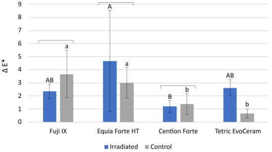 The comparison of the discoloration parameter Δ E* between the IR group and the C group indicates that the difference in perceptible color change was statistically significant only for Tetric EvoCeram which showed higher discoloration in the IR group (Figure 3), p < 0.001. In the comparisons among the materials (p < 0.001), the statistically highest Δ E* values were found for the glass-ionomer-based materials Fuji IX and Equia Forte HT, with comparatively lower values measured for the resin-based materials Cention Forte and Tetric EvoCeram.