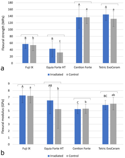 Flexural strength (a) and flexural modulus (b) measured after 35-day radiotherapy for the irradiated (IR) group or 35 days of no treatment for the control (C) group. All of the values are represented as mean ± 1 SD. The square brackets above the bars indicate statistically similar values. The same uppercase letters denote statistically similar values within the IR group. The same lowercase letters denote statistically similar values within the C group.
