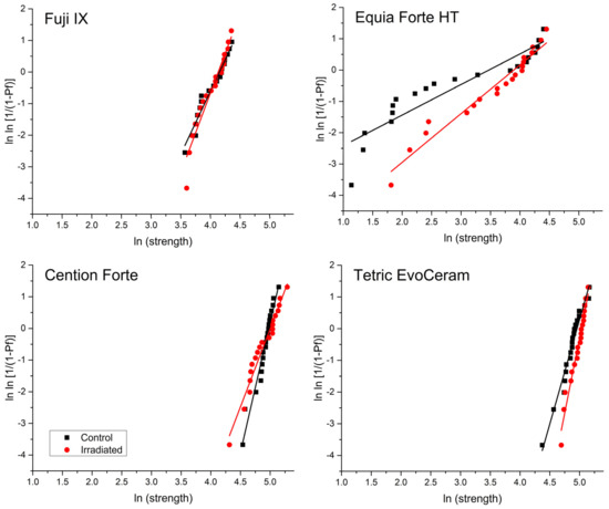 The FS values were used to perform Weibull reliability analysis by plotting the function ln [1/(1 − Pf)] = m (ln σ − ln σθ), where Pf = probability of failure, m = Weibull modulus, σ = flexural strength at failure, and σθ = characteristic strength [27]. The parameter “m” represents the shape parameter of the Weibull distribution and is useful for quantifying the changes in material reliability caused by exposure to radiotherapy. Weibull graphs were plotted using n = 20 per experimental group and a linear fit was performed using maximum likelihood estimation.