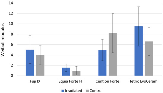 Estimated values of the Weibull modulus for the irradiated (IR) group and the control (C) group. Error bars represent limits of 95% confidence intervals.