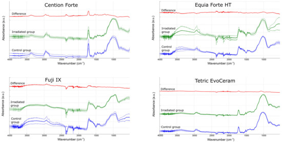 FTIR analysis can provide some insight into the chemical changes that result from exposure to radiotherapy, provided that these changes occur within molecular structures that give rise to FTIR spectral bands. Literature data on the effects of radiotherapy on FTIR spectra are sparse, and there are only two studies that reached conflicting conclusions [16,45]. While the study by Brandeburski et al., reported no effects of 70.2 Gy (1.8 Gy/day for 39 days) on the ATR-FTIR spectra of resin composites and glass ionomers [16], another study claimed to have found differences in FTIR spectra collected in diffuse reflectance mode for specimens irradiated with single doses of 0.25–1.00 Gy [45]. Because the results of the latter study were not supported by statistical analysis and the observed changes in the FTIR spectra were random rather than dose-dependent, the level of evidence for a deleterious effect of radiotherapy remains modest. The FTIR data from our study are also inconclusive and therefore insufficient to claim a true change in the intensity of specific spectral bands. Although the subtraction of the averaged spectrum of the IR group from that of the C group showed differences in certain spectral bands distinct from random fluctuations (e.g., the band at 1716 cm−1 for Cention Forte, corresponding to carbonyl group stretching), these differences were not statistically significant because of the high variability within each group. Thus, our FTIR study suggests possible spectral changes due to radiotherapy; however, the available results are not sufficient to confirm a statistically significant effect.