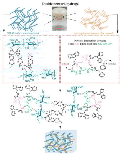 Illustrative scheme of the DN hydrogel formation with PITAU/Alg covalent gel as the first network and self-assembled peptides as the second network.