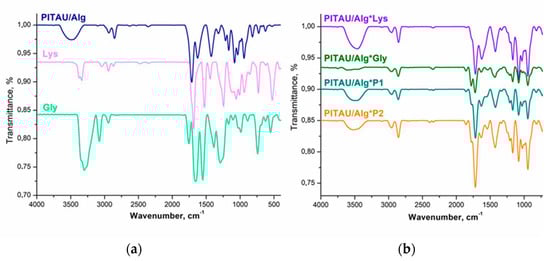 The PITAU/Alg pre-gel spectrum combines both the characteristic bands of the copolymer and those of the polysaccharide (Figure 2a). A detailed analysis of the FTIR spectrum of this hybrid gel is already described in previous studies [].