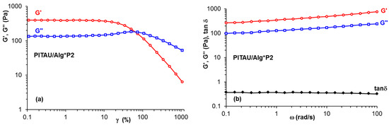 The dependence of the viscoelastic parameters for the sample PITAU/Alg*P2 in (a) amplitude sweep tests and (b) frequency sweep tests.
