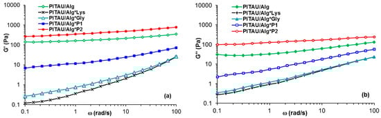 The plots show a network structure, G′ > G″ and tanδ ≈ 0.34. Small variations of G′ and G″ observed in Figure 3b are attributed to dynamics of intermolecular interactions under oscillatory deformations. The hydrogel strength increases as the content of Gly increases, thus G′ for PITAU/Alg*P2 exceeds the value of G′ registered for PITAU/Alg (Figure 4). This fact was expected considering the more numerous possibilities of forming physical bonds of Gly through its available functional groups, compared to Lys which can make fewer intermolecular bonds due to the steric hindrances generated by the presence of the two bulky Fmoc groups. The lowest values of G′ are obtained for PITAU/Alg samples in the presence of one peptide, Gly interactions with polymer chains being slightly higher compared with Lys: these two samples present G″ > G′ (liquid-like behavior). Another observation concerns the slope of G′ and ω dependences, from approx. 0.7–0.8 for PITAU/Alg in the presence of one peptide to 0.15 for PITAU/Alg or PITAU/Alg*P2. In the case of G″, the slopes vary between 0.67 (PITAU/Alg*Lys or PITAU/Alg*Gly) and 0.14 (PITAU/Alg*P2).