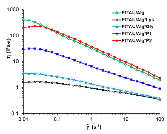 Shear-thinning behavior is an important feature for applications of injectable hydrogels, i.e., the viscosity decreases when a shear flow is applied to materials. The prepared hydrogels present injectability, the viscosity decreases as the shear rate increases above 0.04 s−1 (Figure 5). In the non-Newtonian region, the apparent viscosity (η) scales as , where the power law index, n, varies between 0.2 (sample PITAU/Alg*Lys) and 0.6 (PITAU/Alg*P2 or PITAU/Alg samples). More than that, the DN hydrogels injected into the body are able to quickly self-heal after the external force is removed (Figure 6).