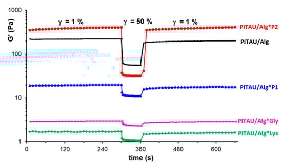 The samples PITAU/Alg*P1 and PITAU/Alg present similar behavior as shown in Figure 7, whereas samples PITAU/Alg*Lys and PITAU/Alg*Gly recover their structure only after one cycle from 1% to 50% and again to 1%; for higher deformations, the samples were not able to recover their structure.