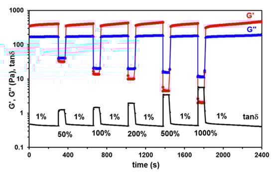 The structure recovery (self-healing ability) was studied in oscillatory shear experiments. A constant ω value of 10 rad/s was set and the strain amplitude was systematically changed during successive runs from low (1%), high (50%, 100%, 200%, 500%, 1000%), and low again (1%) values, respectively. G′, G″, and tanδ were measured as a function of time.