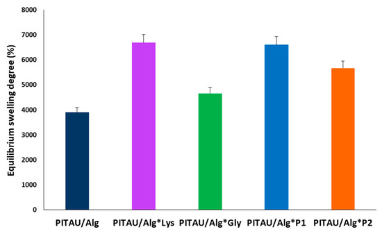 The chemical nature of the used compounds has a significant impact on the formation of highly hydrophilic materials and in determining the superabsorbent properties. Therefore, upon exposure of PITAU/Alg pre-gel to PBS at pH = 7.4, the carboxyl groups (COOH) of the polysaccharide are ionized into carboxylate groups (COO−), and as a result, anion-anion electrostatic repulsion forces are formed in the hydrogel that increase the distance between the polymer chains and allow water diffusion into the matrix []. Next, the inclusion of the second network based on amino acids/peptides in the DN hydrogel highly increases the equilibrium swelling degree (SDE). This can be explained by SEM microscopy which reveals for the DN systems a very porous three-dimensional network interspersed with a fibrous network that allows a better diffusion of water molecules compared to the PITAU/Alg pre-gel which has a denser and inhomogeneous morphology with small or collapsed pores. Interestingly, the SDE order (from high to low) for the four DNs was PITAU/Alg*Lys > PITAU/Alg*P1 > PITAU/Alg*P2 > PITAU/Alg*Gly, indicating that a higher Lys content allows for more water to be absorbed. As shown by the rheology data, the addition of Gly to the DN systems resulted in hydrogels with a tighter network due to the formation of more physical interactions through its available functional groups which, in turn, leads to less swelling due to the hindered mobility of the chains. The presence of Lys leads to the formation of fewer intermolecular bonds due to the steric hindrance generated by the presence of the two aromatic moieties and, consequently, allows the movement of water molecules in the network.