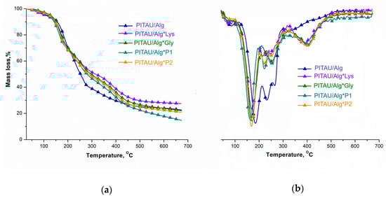 The thermal behavior of the DN hydrogels based on a hybrid pre-gel interpenetrated with amino acids/peptides was investigated and it is presented in Figure 9, while in Table 2 the main thermal parameters are presented. PITAU/Alg has five stages of decomposition, whereas the DN systems have four stages of decomposition. In the case of PITAU/Alg, the mass loss recorded in the first stage (~4.70%) is associated with the evaporation of water from the network. The second decomposition process shows the highest mass loss (28.48%) due mainly to the breakage of the OH, COOH, and COO- functional groups, with a Tpeak at a temperature of 184°C. The third stage of decomposition with a Tpeak at 230 °C and a mass loss of 15% occurs as a result of the decomposition of the glycosidic bonds in the polysaccharide structure []. According to the study by Shen et al., the decomposition of spiroacetal-type structures occurs in the range of 210–349 °C []. Therefore, stage IV with a Tpeak at 265 °C and a mass loss of ~11% corresponds to the degradation of the spiroacetal fragments in the PITAU copolymer structure. The last degradation process with a Tpeak at 325 °C occurs as a result of the decarbonylation reaction of sodium alginate, forming aliphatic derivatives and releasing CO2.