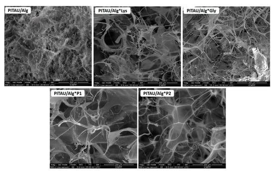SEM was used to assess the morphology of the DN hydrogels but also to understand the relative differences in microstructure after the addition of the peptides and formation of DN gels. The results are displayed in Figure 10. Thus, PITAU/Alg gel exhibits a dense and inhomogeneous structure with very small or collapsed pores. All four DN hydrogels show a different morphology given by the predominantly fibrous nature of the amino acid/peptide. The synthesized compounds present a structure with large pores interspersed with a fibrous network. The sample with Gly (PITAU/Alg*Gly) and Lys (PITAU/Alg*Lys) show a morphology consisting of highly interconnected fibrous networks, whereas the two DNs that have as the second network the amino acid/peptide co-assemblies (PITAU/Alg*P1 and PITAU/Alg*P2) in different ratios, were composed of more homogeneous porous structures with interlaced fibers. These results indicate that the use of the co-assembly could change the molecular arrangement during the assembly process. Based on the SEM images, we can conclude that the second amino acid/peptide self-assembled network was successfully integrated into the first network constituted by PITAU/Alg by inducing strong hydrogen bonds, thus leading to the successful obtaining of a DN system.