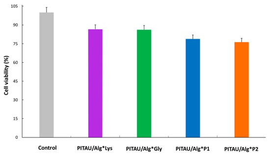 To identify whether the studied materials were cytotoxic, skin fibroblasts were exposed to the DN hydrogels, while cell viability was quantified using the standard MTT assay. Experiments revealed that the DN hydrogels gave > 75% cell viability after 96 h culture (Figure 11). These results suggest that the prepared compounds could be considered biocompatible because, according to the specialized literature, a material is considered cytocompatible if the percentage of viable cells is equal to or greater than 70% [,,]. To conclude, in terms of material safety, the proposed DN systems can thus be considered potentially non-toxic, holding promise as injectable materials for biomedical applications, such as tissue engineering.