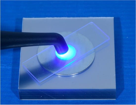 The hole was filled with the cement with great attention to avoid major overfilling. Then another sheet of PVC was applied and slightly pressed with a microscope glass to avoid porosities or air entrapment within the material. The discs were light-cured for 10 s with a polymerization lamp (Kerr Demi Ultra, Kerr, Orange, CA, USA) with a power output of 1.100 (base)/1.330 (peak) mW/cm2 (Figure 1).