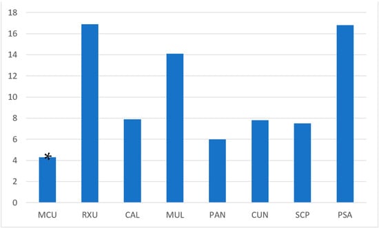 The spectrophotometric analysis revealed a wide range of discoloration among the tested materials (Table 2) and all the investigated cements have shown color variability below the threshold for clinical acceptability (AT: ΔE* ab = 2.66) and perceptibility (PT: ΔE* ab = 1.22) [,,]. Among the tested materials, MCU showed the lowest color change whereas PSA and RXU showed the highest. This finding is in line with Shiozawa et al. [], who reported the highest color stability for two shades of Maxcem Elite in respect to all the other investigated cements (Clearfil SA Cement Automix, RelyX Unicem 2 Automix, Super-Bond C&B), after 1 week of water storage.
