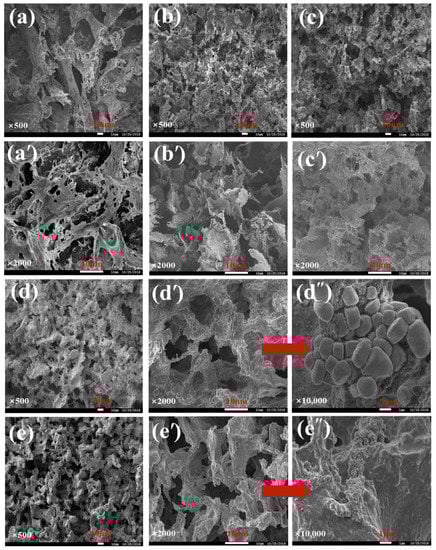 SEM images of the different PAM composite aerogels. (a,a′) PAM, (b,b′) PAM/Ms, (c,c′), PAM/K, (d,d′,d″) PAM/MsCa, (e,e′,e″) PAM/KCa.
