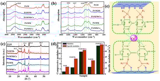 (a) FT-IR spectra and enlarged spectra of the different PAM composite aerogels in the range of 4000–600 cm−1, (b) 1800–600 cm−1; (c) XRD patterns of the different PAM composite aerogels; (d) Compressive properties of the different PAM composite aerogels. (e) Schematic diagram of interpenetrating cross-linking (IPN) network mechanism of PAM aerogels with silane and Ca-alginate.