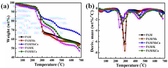 The thermal decomposition process and thermal stability of the different PAM composite aerogels were investigated, and the corresponding thermogravimetric (TG) and differential thermogravimetric (DTG) curves are shown in Figure 3a,b, respectively. The thermal decomposition temperature at 5% weight loss (T5%) of the PAM/Ms aerogel decreased to 234.0 °C (Table 2), the first maximum thermal loss temperature (Tmax1) increased to 301.9 °C, and the corresponding maximum thermogravimetric loss rate (dW/dt) increased to 7.7%·min−1, which were mainly due to the dehydration reaction between PVA, SA, and hydroxylateds silane. For the PAM/K aerogel, the T5% and Tmax1 further reduced, and the second maximum dW/dt concomitantly increased, which were mainly attributed to the decomposition of amino- and alkyl groups of the cross-linked PAM/K aerogel, thus leading to the decrease of the residue yields of the PAM/Ms and PAM/K aerogels at 700 °C to 51.5% and 46.2%, respectively. For the PAM/MsCa and PAM/KCa aerogels, the Tmax1 and Tmax2 values were higher than those of the PAM/Ms and PAM/K aerogels, and the corresponding maximum weight loss rates decreased from 6.3%/min of the PAM aerogels to 1.8%/min and 2.9%/min; hence, the residue yields of the PAM/MsCa and PAM/KCa aerogels increased to 64.1% and 49.6%, respectively. The incorporation of Ca-alginate particles promoted the formation of the residues. Thus, the char yield of the PAM/MsCa and PAM/KCa aerogels were obviously higher than the corresponding PAM/Ms and PAM/K aerogels, respectively.