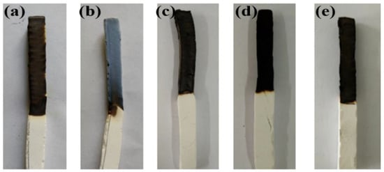 Digital photographs of the different PAM composite aerogels after LOI test. (a) PAM, (b) PAM/Ms, (c) PAM/MsCa, (d) PAM/K, (e) PAM/KCa.