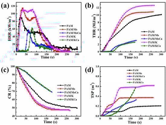 THR/TML value (the heat release rate per gas mass) is a commonly used parameter to analyze the flame retardant mechanism in the gas phase, and the reduction of THR/THL value indicate there is a gaseous flame retardant mechanism in the flame-retardant polymer materials [39,40]. The THR/TML values for the PAM/Ms and PAM/K aerogels increased to 1.88 and 1.93 MJ·m−2·g−1, respectively, because the decomposition of combustible gases in the PAM/Ms and PAM/K aerogels in the gas phase resulted in the slight decrease in the flame retardancy. The THR/TML values of the PAM/MCa and PAM/KCa aerogels obviously decreased to 0.51 and 0.46 MJ·m−2·g−1, respectively, because the decomposed inert gases (such as H2O, CO2, etc.) of the PAM/MsCa and PAM/KCa aerogels in the gas phase were conductive to the improvement of flame retardancy.