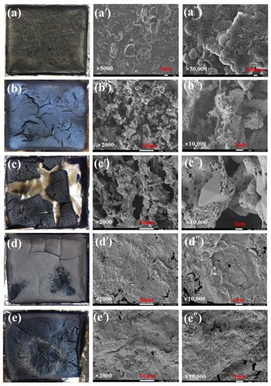 Digital photographs (a–e) and SEM (a′–e′,a″–e″) images of the residues for the PAM composite aerogels after cone calorimeter test. (a,a′,a″) PAM; (b,b′,b″) PAM/Ms; (c,c′,c″) PAM/MsCa; (d,d′,d″) PAM/K; (e,e′,e″) PAM/KCa.