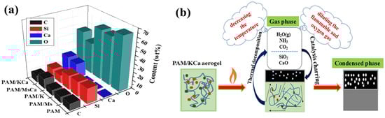 (a) Relative elemental compositions of the residues for the different PAM composite aerogels after cone calorimeter test by SEM–EDS measurement; (b) Schematic diagram of the possible flame retardancy mechanism of the PAM/KCa aerogel.