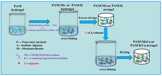 A PAM composite hydrogel was prepared according to the previous literature, and the weight ratios of PVA, alginate, and MMT components were 4 wt%:4 wt%:4 wt% in deionized water, respectively [36]. The pH of the PAM hydrogel was adjusted to 11 by adding ammonia water, and 2 wt% silane was slowly dropwise added and stirred for 5 min at 1000 rmp, until the viscosities of dispersion obviously increased. The cross-linked PAM aerogels were obtained after the freeze-drying of the hydrogel in a lyophilizer at −50 °C and 10 Pa for 48 h. The prepared sample was referred as PAM/Ms or PAM/K aerogel, where MTES and APTS as the cross-linking agents referred to Ms and K, respectively.