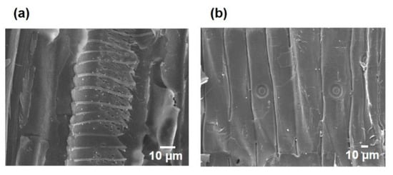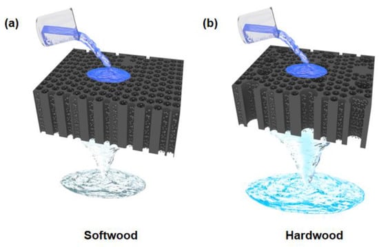 Natural wood can be divided into broadleaf wood and coniferous wood, which are called hardwood and softwood, respectively [24,25]. Hardwoods are composed of fiber tracheids and vessel elements, which account for approximately 20% and 50% of wood pore volume, respectively. The vessel elements have a larger diameter than the fiber tracheids. Generally, the vessel elements are connected by perforated plates with micron holes at the cell ends, which allow water to continuously travel along the wood microchannels. Unlike hardwoods, softwoods have only fiber tracheids for transporting water and ions. The significantly different structures of hardwoods and softwoods result in different physical properties [26,27] and functional materials made from them. Therefore, it is of great significance to study the effect of pore structures of natural woods on their water treatment performance.