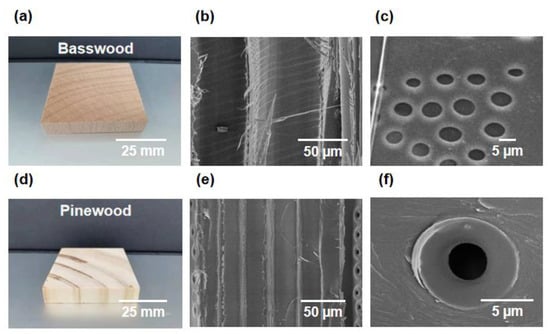 Pore structure and porosity have an important influence on the water treatment performance of natural wood. Figure 3a–c shows the SEM images of the upper surfaces of three different hardwoods, beech wood, balsa wood and basswood, and it can be observed that they have significantly different lumen diameters. In addition, the difference in vessel and tracheid diameter can be clearly seen from the top view of natural wood. In contrast to the complex structure of hardwoods, softwoods have only tracheids with uniform lumen diameter (Figure 3d,e), and the pore diameter of different softwoods does not differ much.