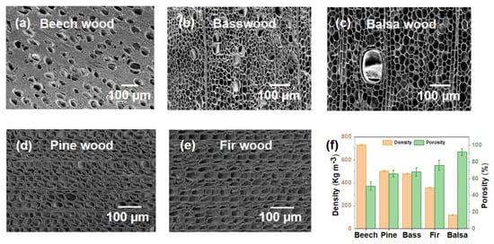 Comparison of pore structure and porosity of hardwood and softwood. SEM images of different hardwoods, (a) beech wood, (b) basswood and (c) balsa wood. SEM images of different softwoods, (d) pine wood and (e) fir wood. (f) Density and porosity of different wood species.