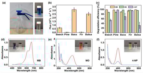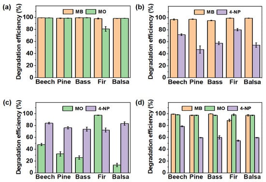The degradation property of PNNW membranes for the MB, MO and 4-NP mixture was further investigated. All PNNW membranes showed a degradation efficiency of more than 90% for MB and MO in the mixed solution. In particular, the beech wood-, pine wood-, basswood- and balsa wood-based PNNW membranes had a degradation efficiency of more than 98% for both pollutants. However, the degradation efficiency of all PNNW membranes for 4-NP in the mixed solution was less than 80%, similar to the situation of the two pollutants (Figure 6d). Through the above analysis, it can be concluded that the degradation property of PNNW membranes for different organic pollutants in the mixed solutions is affected by the types of pollutants.