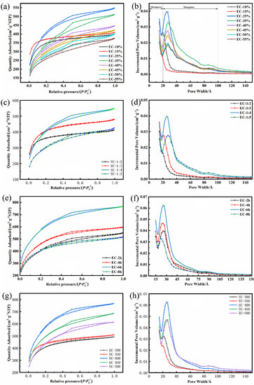 (a,c,e,g) Nitrogen adsorption-desorption curves of ECs; (b,d,f,h) Pore size distribution curves of ECs.