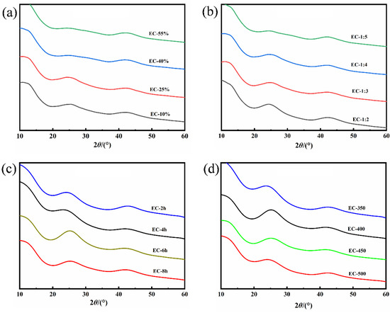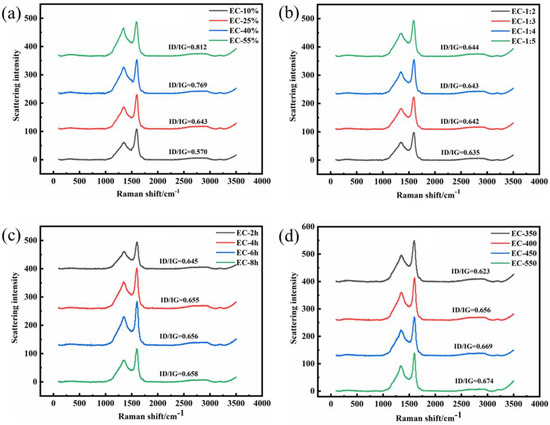 AC was considered to be composed of a regular lamellar crystal structure and irregular carbon. XRD technique is an effective means to explore the microcrystalline structure of ACs. Figure 2 was the XRD pattern of ECs. It can be observed that there are two absorption peaks at 24° and 43°, corresponding to the (002) and (100) crystal surfaces, respectively [1]. The etching effect of H3PO4 will destroy the relatively regular wafer crystal structure in the EUO wood, causing the crystal plane diffraction peak to gradually flatten, and forming amorphous AC with flourishing pores and prodigious specific surface area. The increase in H3PO4 concentration and dosage, activation temperature, and activation time weakened the diffraction peak of the 002 crystal surface gradually. These phenomena were consistent with the analysis of the adsorption and desorption and pore distribution curves in the aforementioned part (Figure 1). On the whole, the peaks of XRD patterns were broad generally, which implied the low graphitization and irregularity of ECs with an abundant amorphous structure. Moreover, Raman spectroscopy was also employed to analyze the amorphous structure of the ECs. The Raman spectrums of all samples demonstrated typical absorption peaks at 1350 cm−1 and 1600 cm−1, corresponding to the D band and G band of carbon singly. The appearance of the D band was attributed to the disordered characteristics caused by lattice defects and impurities of carbon atoms, while the G band represented the stretching vibration in the hybrid plane of carbon atoms, sp2 [35]. Normally, the graphitization degree of carbon material was measured by the strength ratio of the D band to the G band (ID/IG, where ID and IG are the D-band and G-band Raman intensities) [36,37]. As shown in Figure 3a,b, when the pyrolysis time and temperature were fixed (400 °C for 2 h), the graphitization degree was affected by the concentration and dosage of phosphoric acid. It can be concluded that the presence of increased H3PO4 solution can promote the formation and expansion of pores during the activation process, which revealed the amorphous of ACs. On account of the reduction in graphitization (the ratio of ID/IG in Figure 3a,b), the defects of AC were magnified with the increased average pore size. The effect of heat preservation time and activated temperature on the crystallinity of AC in the pyrolysis process was demonstrated in Figure 3c,d. The ratio of ID/IG was 0.645 (EC-2 h), 0.655 (EC-4 h), 0.656 (EC-6 h) and 0.658 (EC-8 h), respectively, in Figure 3c. Meanwhile, the ratio of ID/IG severally was 0.648, 0.656, 0.669, and 0.674 for ECs with the activation temperature as a variable (Figure 3d). It can be observed that the ratio of ID/IG was magnified slightly with the extension of the activation time and the increase in activation temperature, lessening the graphitization of AC to some extent. Peculiarly, significant otherness can be obtained by analyzing the strength of the D-band. The D-band represents the defect site on the structure of the AC based on the Raman spectrums. The maximum strength of the D-band (101.7) and G-band (155) can be noticed, as the H3PO4 concentration was 25%, the mass ratio feedstock-activator was 1:4, the activation time was 6 h, and the activation temperature was 400 °C, which was attributed to the defects in the carbon atom crystal, and a highly porous disordered structure was formed. Therefore, the amorphous structure of AC was expected to possess the capacity to store a large amount of charge.