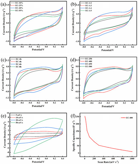 (a–d) The CV curves of ECs at 5 mV·s−1; (e) the CV curves of EC-400 at different scan rates; (f) the specific capacitance of EC-400 at different scan rates.