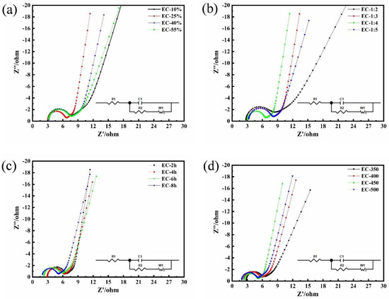 The sinusoidal potential wave generated the response current of the three-electrode system, and the EIS was plotted by measuring the response function of the electrode system in the wide frequency range (0.01 Hz to 100,000 Hz) (Figure 6). The EIS can not only display the series resistance of the AC-based electrode but also analyzes the dynamics of the charging and discharging process. In general, the EIS consists of the real part Z’ and the imaginary part Z”, and divides into three blocks (high-frequency region, intermediate frequency region (impedance region), and low-frequency region). The inset equivalent circuit was shown in Figure 6c that included the equivalent circuit parts of Rs (the intrinsic resistance of the substrate or electrolyte resistance), Rct (the charge transfer resistance), and W (the Warburg impedance). The spectrum of the high-frequency region exhibited a semicircle shape, which matched the Rct. The ECs all exhibit smaller Rs and Rct, as shown in Table 4. It can be found that the average pore size of the sample was inversely proportional to the magnitude of the Rct. In detail, the smallest Rct was 2.488 Ω and the largest Rct was about 4.379 Ω. The electron conductivity was limited by the magnitude of Rct, which indicated that the excellent conductivity of the EUO-based electrode materials was conducive to electrochemical performance. In the intermediate frequency region, the impedance curve presented a line of about 45°, which implied the ion-diffused resistor (Rw) in the pores of the carbon electrode [42]. It also revealed a transition from resistive behavior to capacitive behavior. The low-frequency region was formed due to the charge-discharge performance of the porous structure surface; the value of the frequency was inversely proportional to the magnitude of the slope, expressing the typical capacitance performance in the electrodes. For an ideal electrode material, the curve was a straight line perpendicular to the X-axis. The ECs exhibited typically capacitive characteristics on account of the well-developed mesoporous structure with a large specific surface area except for EC-10%, EC-55%, EC-1:2, and EC-350. These results suggested that numerous mesoporous and well-developed pore structures could create a satisfactory contact between electrode and electrolyte.